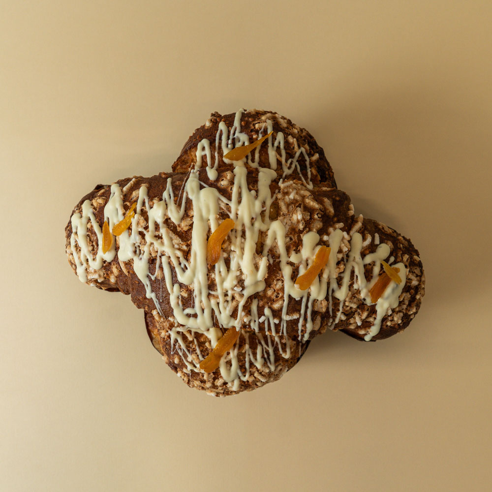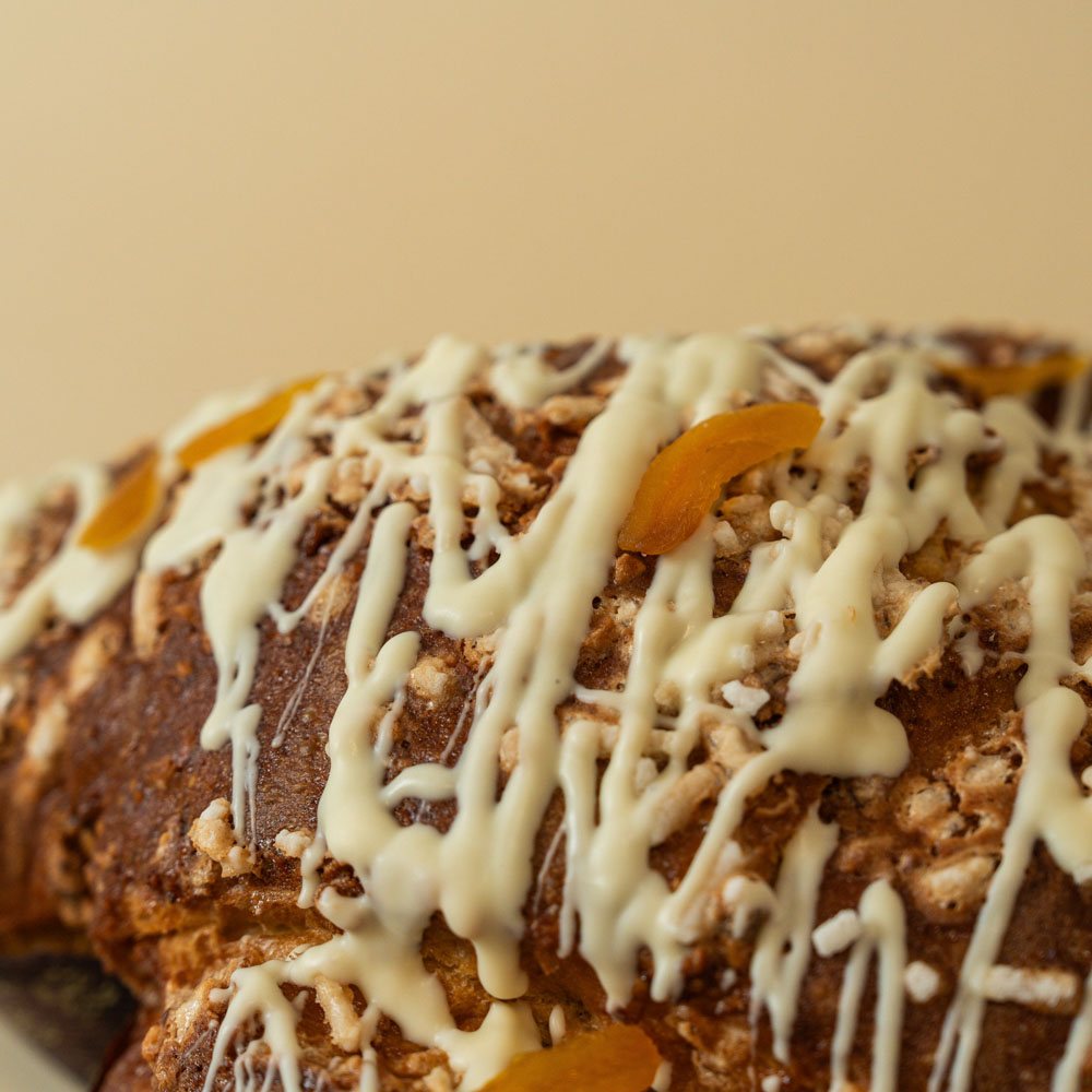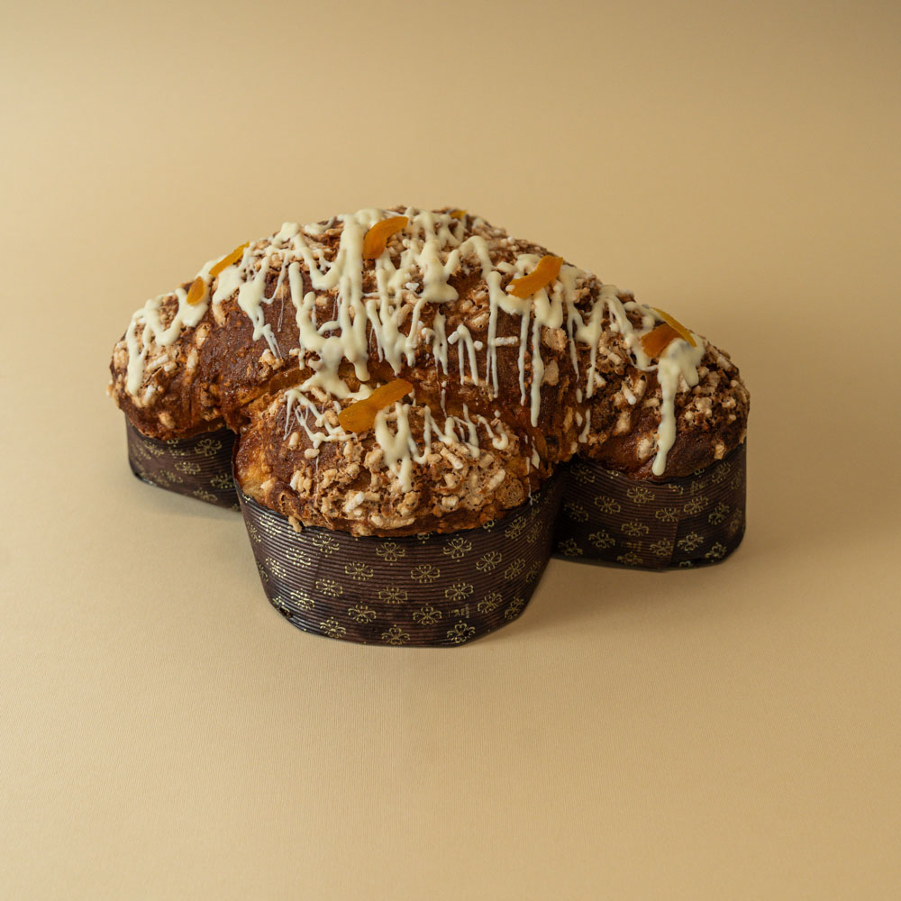 Ingredienti: farina, zucchero, burro, lievito madre, tuorlo, sale, miele, malto, pasta arancia, albicocca candita, cioccolato bianco, farina di mandorle.