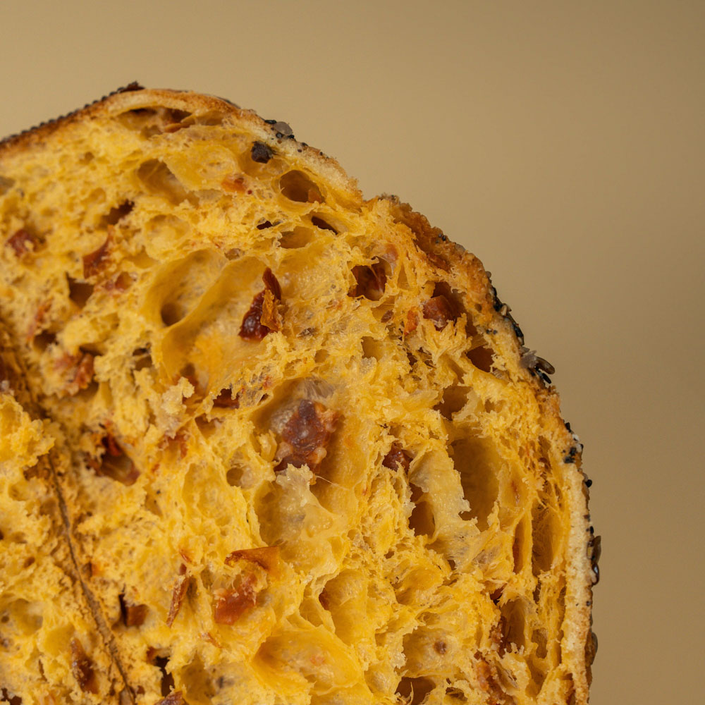 Ingredienti: farina, lievito madre, tuorlo, strutto, olio extravergine di oliva, malto, sale, acqua, spianata piccante, provolone piccante, pomodori secchi, 1% olive e capperi.