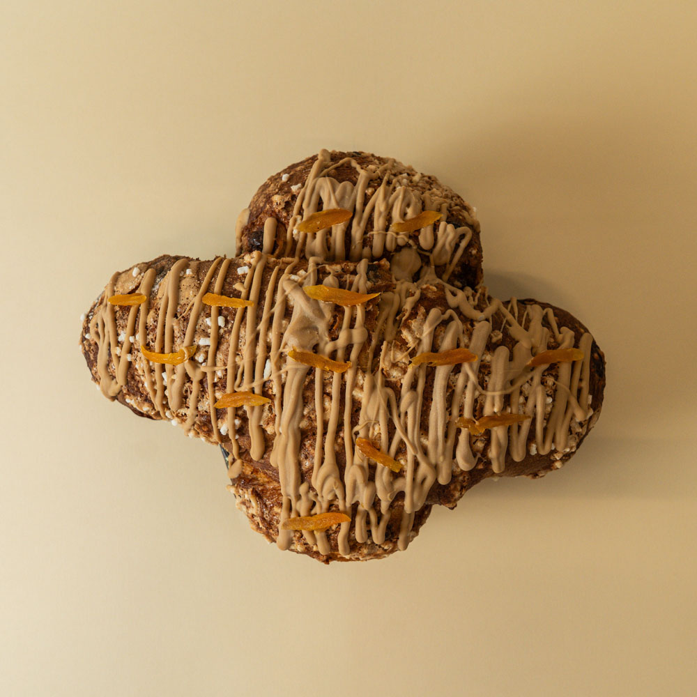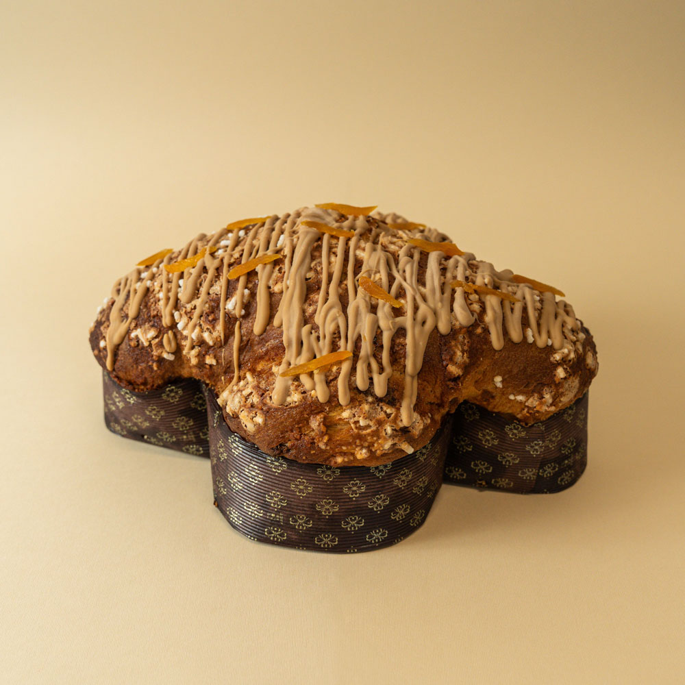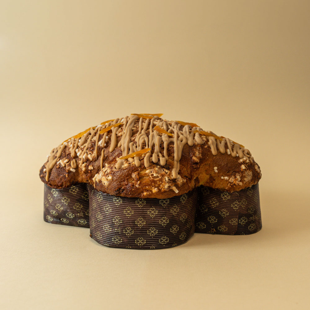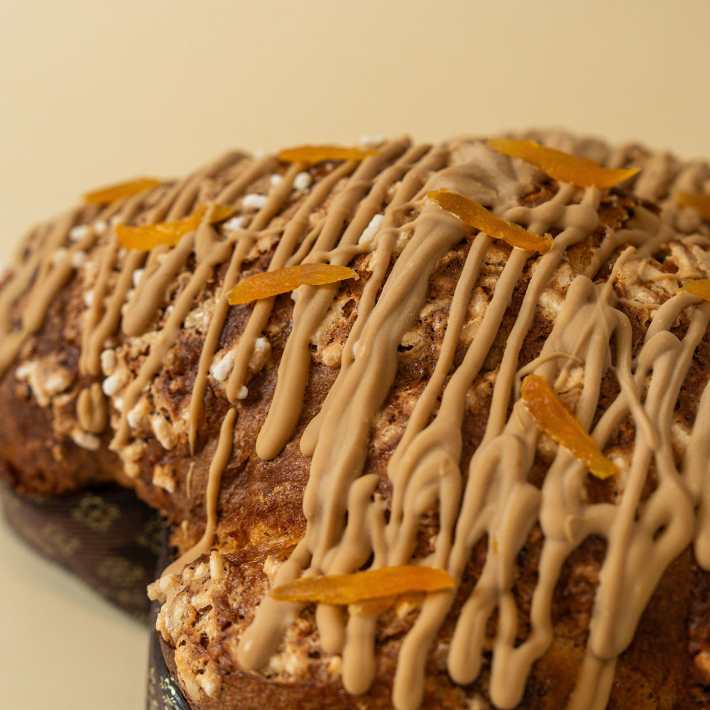 Ingredienti: farina, zucchero, burro, lievito madre, tuorlo, sale, miele, malto, pasta arancia, albicocca candita, cioccolato al caramello, farina di mandorle.